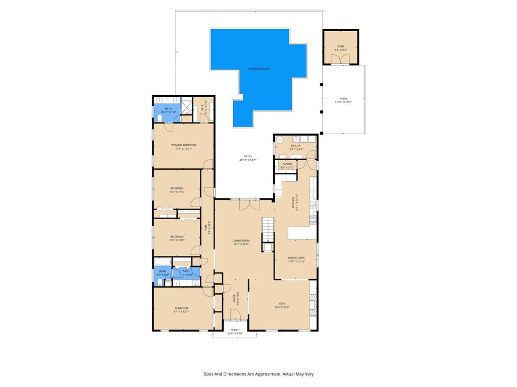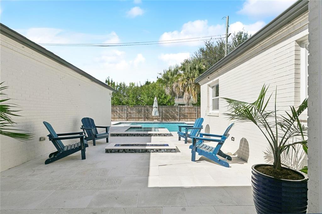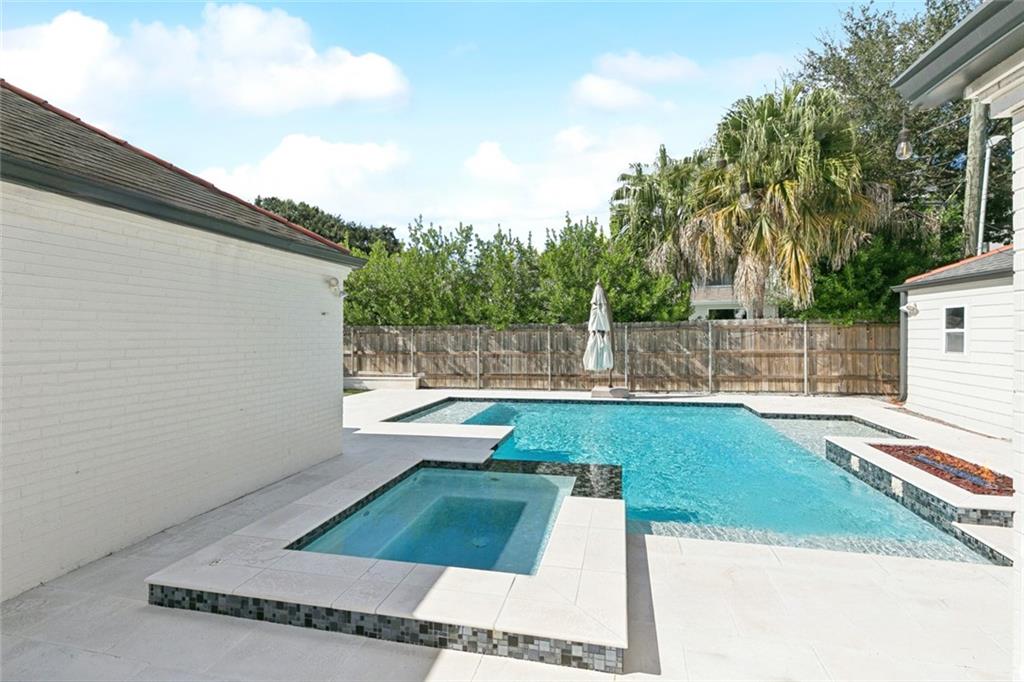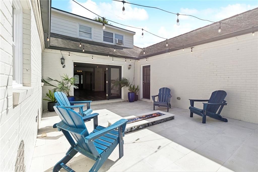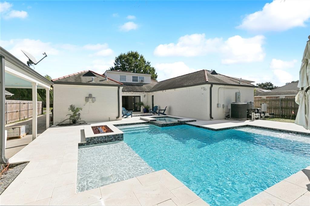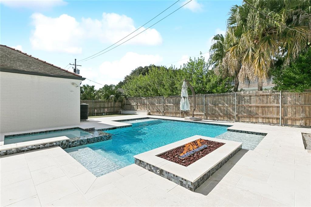 Outdoor living shines with a large tiled patio designed for dining and lounging, a dedicated fire-pit area for cool evenings, and a sparkling pool for sunny New Orleans days. A backyard shed adds handy storage for gear and garden tools, while the long driveway delivers ample off-street parking.